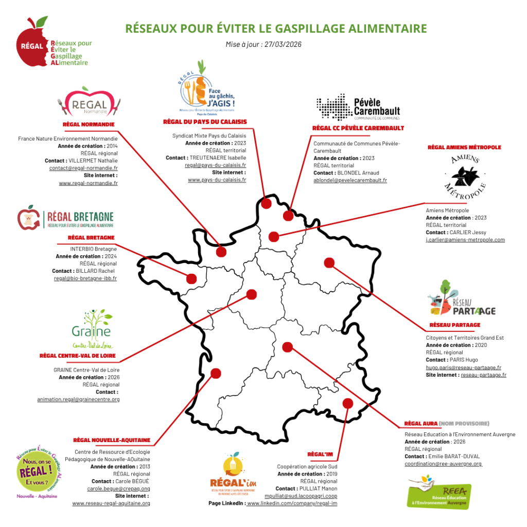 Pour dynamiser la lutte contre le gaspillage alimentaire, plusieurs territoires français ont créé des Réseaux pour Éviter le Gaspillage Alimentaire (RÉGAL).